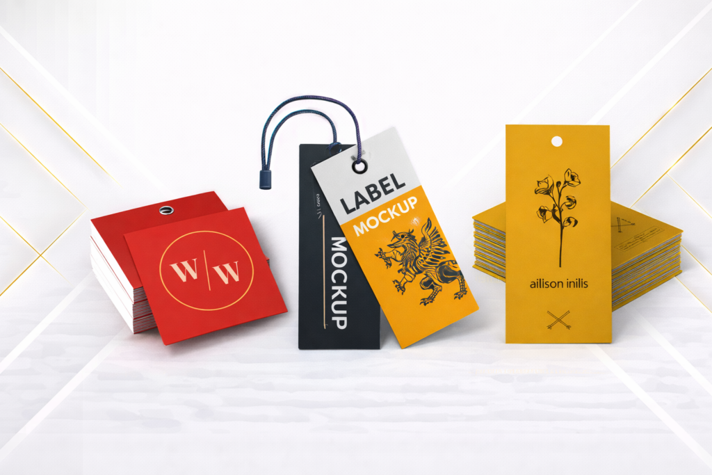Printed tags attached for branding or information. Useful for retail or promotional uniforms, improving presentation and communication.